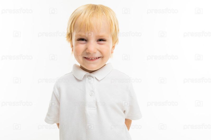 Портрет застенчивого маленького ребенка на белом фоне, мальчик застенчив и смотрит в камеру