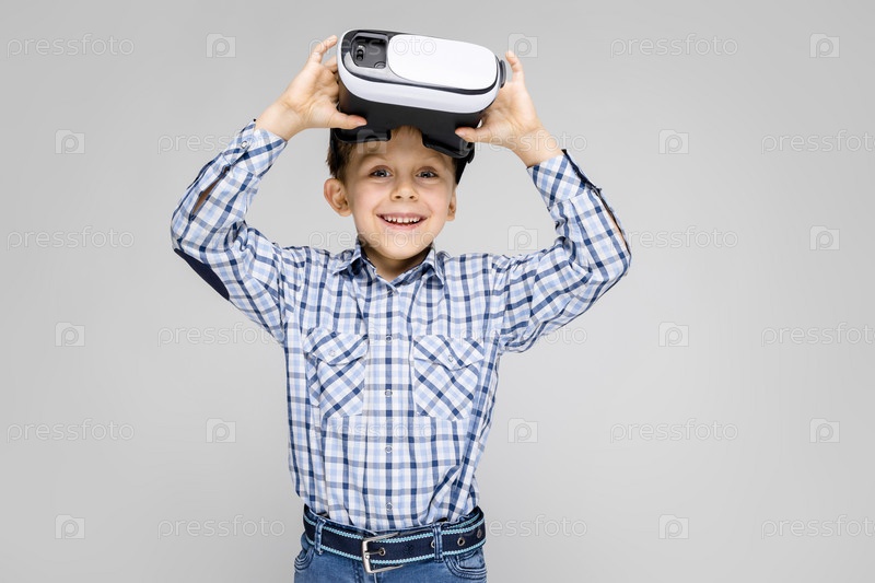 Портрет мальчика на сером фоне. Мальчик в очках виртуальной реальности