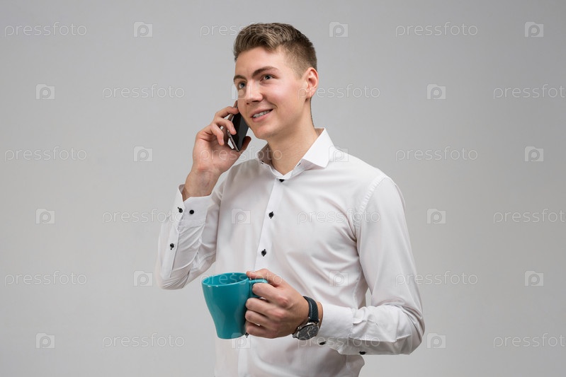 Молодой бизнесмен пьет из кружки с телефоном в руках. Молодой человек дела в белой рубашке в яркой студии самостоятельно. место для этикетки