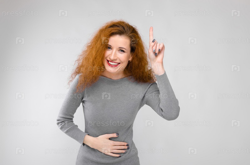 Очаровательная молодая девушка с рыжими волосами. Молодая девушка в сером свитере. Молодая девушка на сером фоне. Молодая девушка держит руку за животом. Молодая девушка показывает большой палец вверх