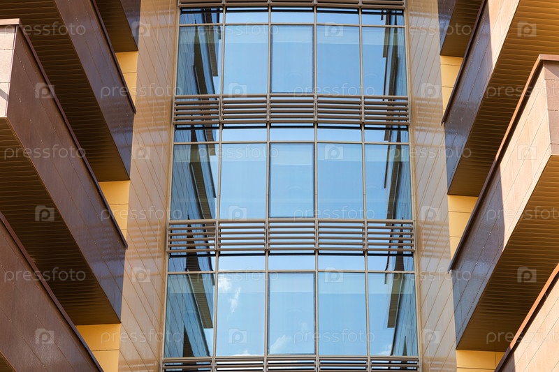 Голубая и золотая стеклянная поверхность стены здания с окнами и бежево-коричневыми балконами