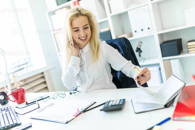 Молодая девушка в офисе сидит за столом, разговаривает по телефону через гарнитуру и листает блокнот