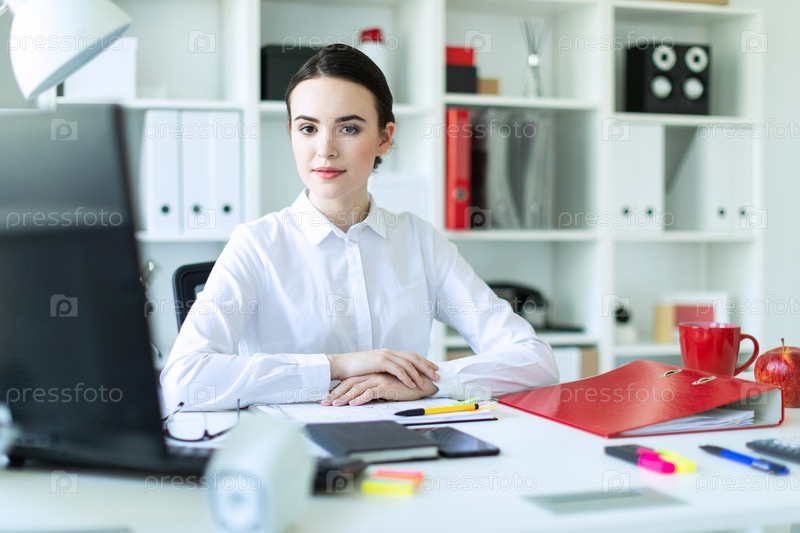 Молодая девушка сидит за компьютерным столом в офисе