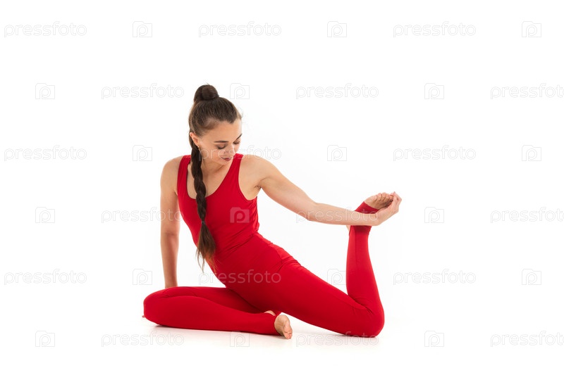 Красивая молодая гимнастка сидит на полу и разминается и растягивает мышцы