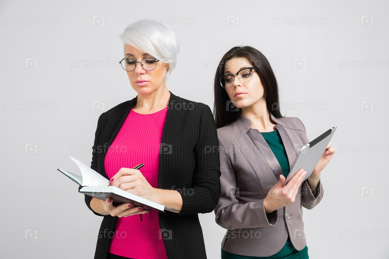 Две уверенные в себе стройные бизнес-леди, держащие ноутбук и серый планшет. Вертикальный портрет на стене в студии
