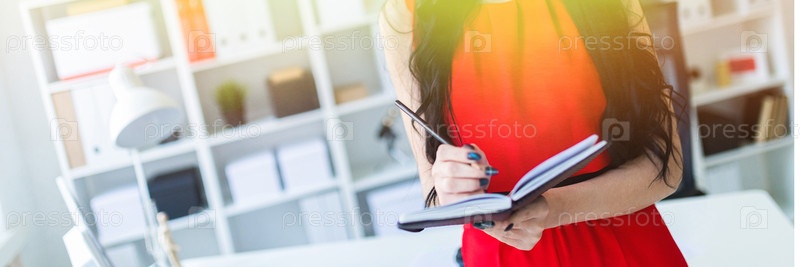 Красивая молодая девушка в красном костюме стоит в офисе и держит блокнот и карандаш