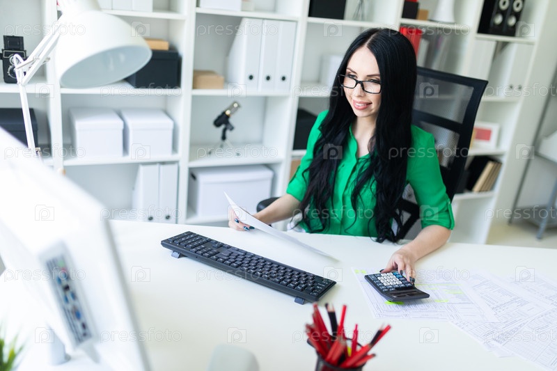Молодая девушка в очках работает в офисе с компьютером, калькулятором и документами