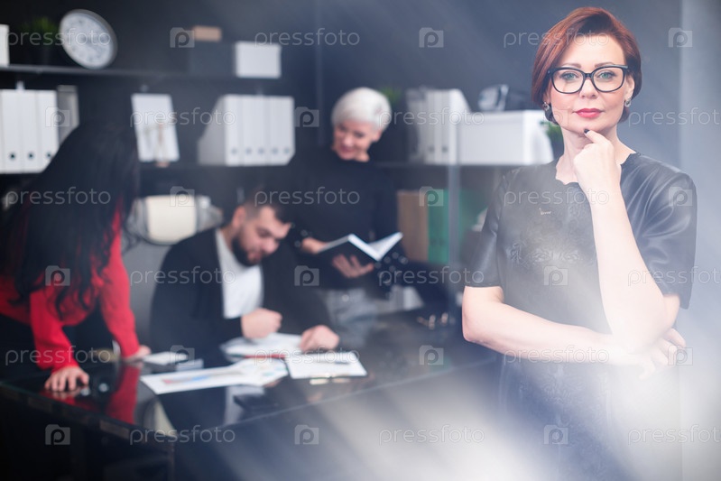 Красивая молодая женщина на фоне рабочих, проводящих собрание. группа успешных бизнесменов. Концепция обсуждения бизнес-группы. свечение внизу изображения