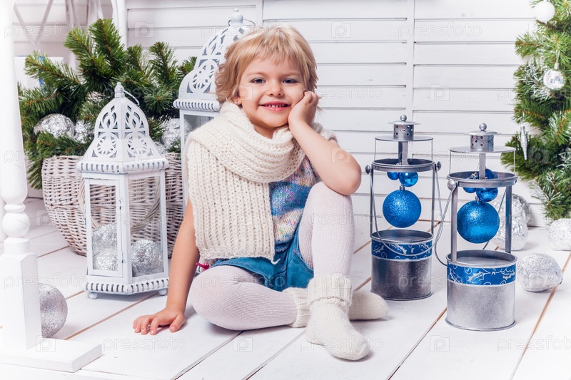 Маленькая улыбающаяся красивая девушка сидит рядом с рождественской елкой и