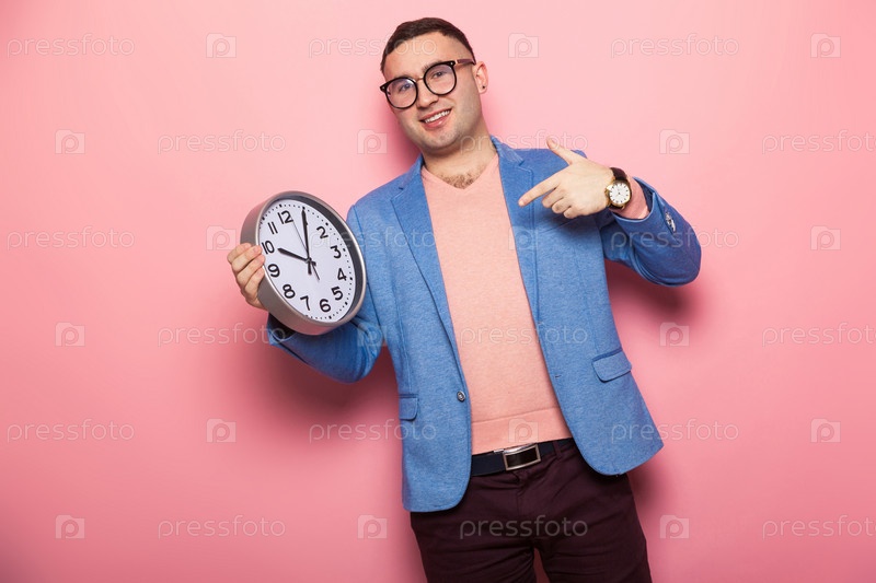 Портрет красивого мужчины в очках, розовом джемпере и синей куртке, указывающего на часы, изолированные на розовом фоне с пунктуальностью копирайта, являющейся поздней концепцией