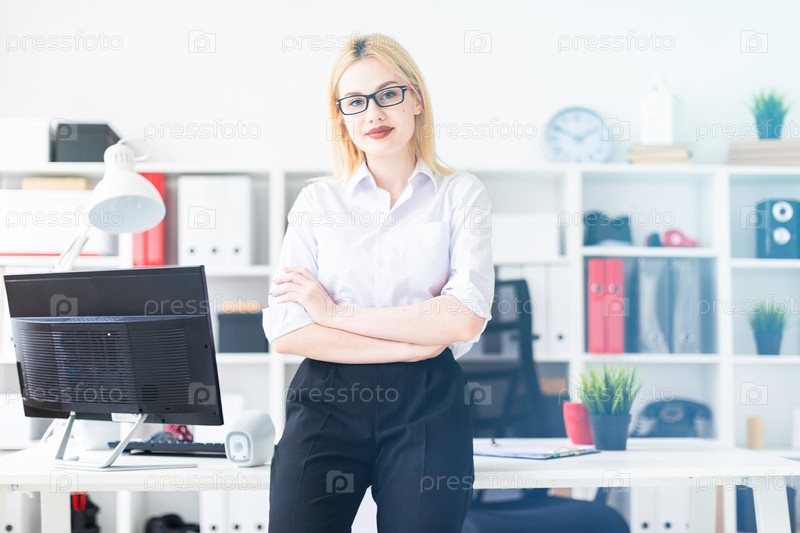 Молодая девушка оперлась на стол в офисе