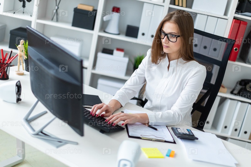Красивая молодая девушка, работающая в светлом офисе. Молодая девушка в белой блузке и черных брюках. У нее длинные темные волосы. Девушка в очках и с красивым макияжем. Молодая девушка сидит на стуле с высокой спинкой. фото с глубиной резкости