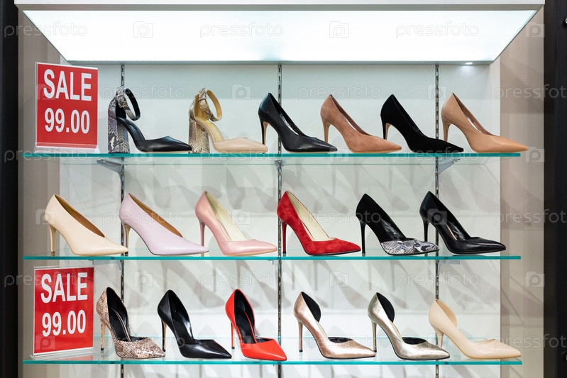 Много красивых женских туфель стоят на окне с большой распродажей