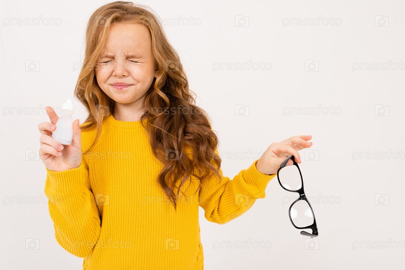 Девушка закрыла глаза после закапывания глаз раствором и держит очки на белом фоне