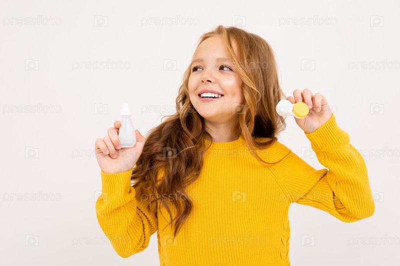 Улыбающаяся девушка держит глазные капли и контейнер с линзами на фоне белой студии