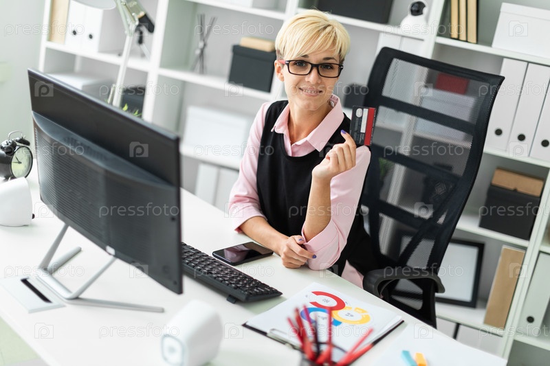Молодая девушка сидит за компьютерным столом и держит в руках банковскую карту