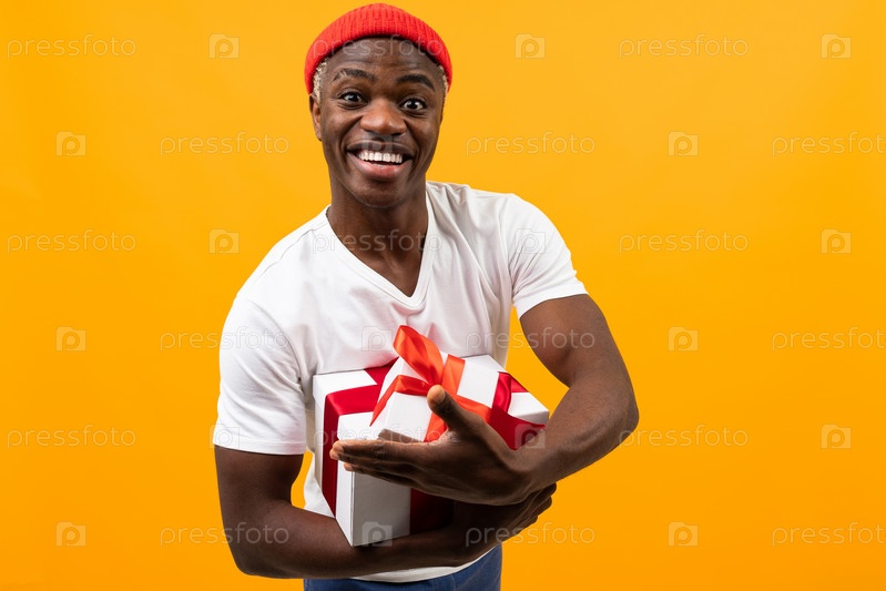 Забавный черный американец с улыбкой в белой футболке держит две коробки в подарок с красной лентой на желтом фоне студии