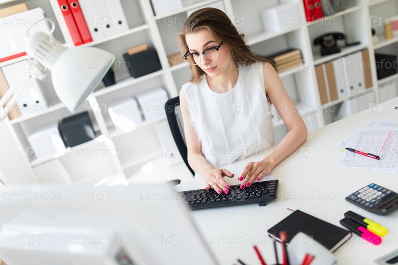 Красивая молодая девушка сидит за столом в офисе и печатает текст на клавиатуре