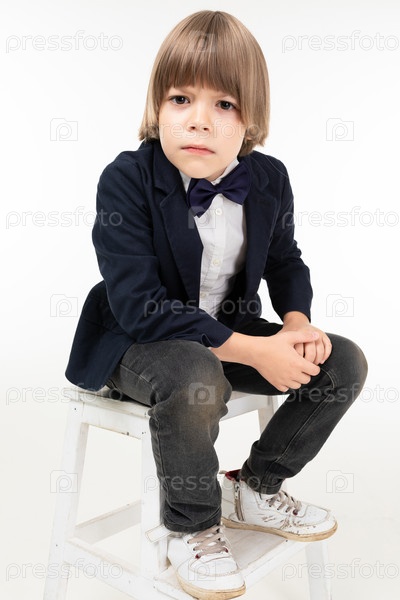Европейский мальчик в черной деловой куртке и белых кроссовках на белом фоне