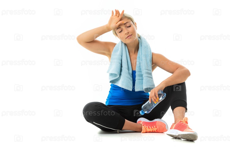 Молодая спортивная девушка со светлыми волосами в черном спортивном топоре, черных леггинсах и ярких кроссовках с полотенцем на шее и бутылкой воды устала после тренировки