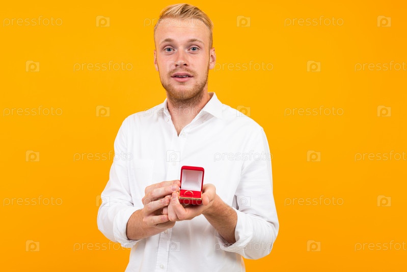 Привлекательный европеец делает предложение, держа кольцо в коробке на желтом фоне