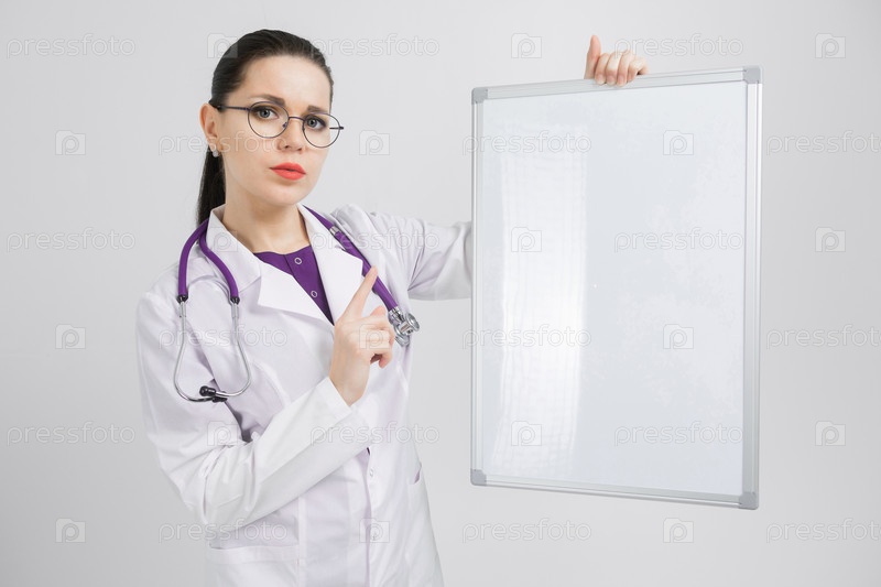 Портрет женщины в очках в белом халате с магнитной доской в руках на белом фоне