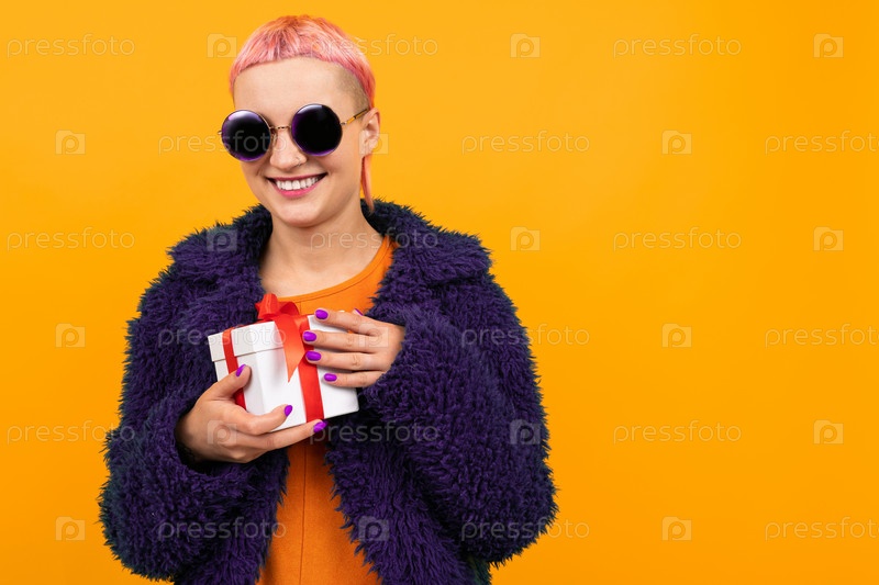 Девушка с розовыми волосами с пирсингом на носу, одетая в шубу и очки, держит подарок на желтом фоне