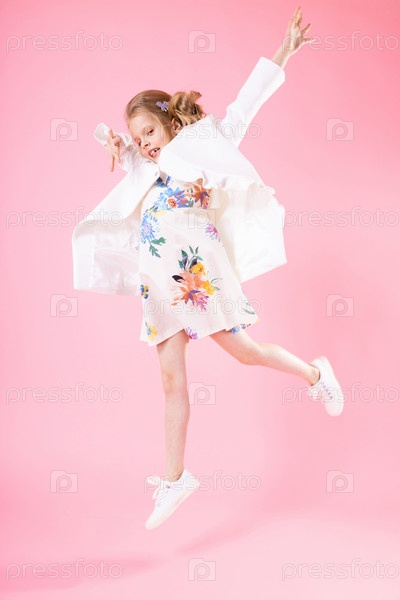 Девочка-подросток в легкой одежде прыгнула на розовом фоне
