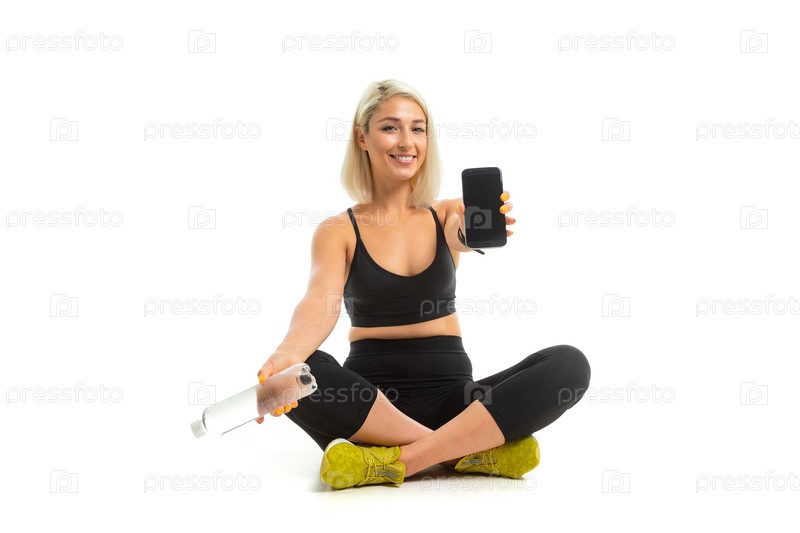 Кавказская спортивная женщина со светлыми волосами сидит с бутылкой воды и показывает телефон