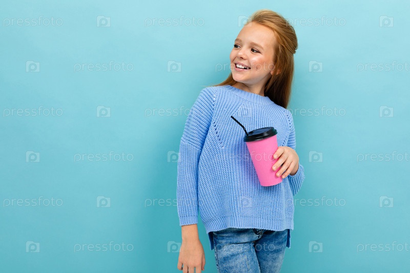Веселая школьница в синем свитере со стаканом кофе на синем фоне смотрит налево