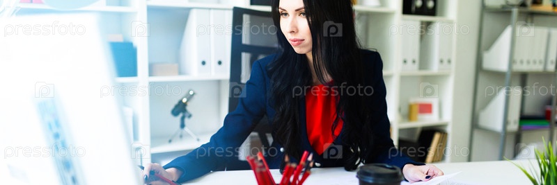 Красивая молодая девушка, работающая с компьютером и документами в офисе за столом