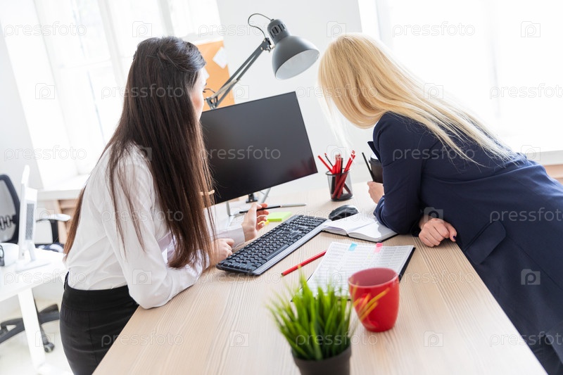 Две девушки стоят в кабинете возле стола и смотрят в монитор