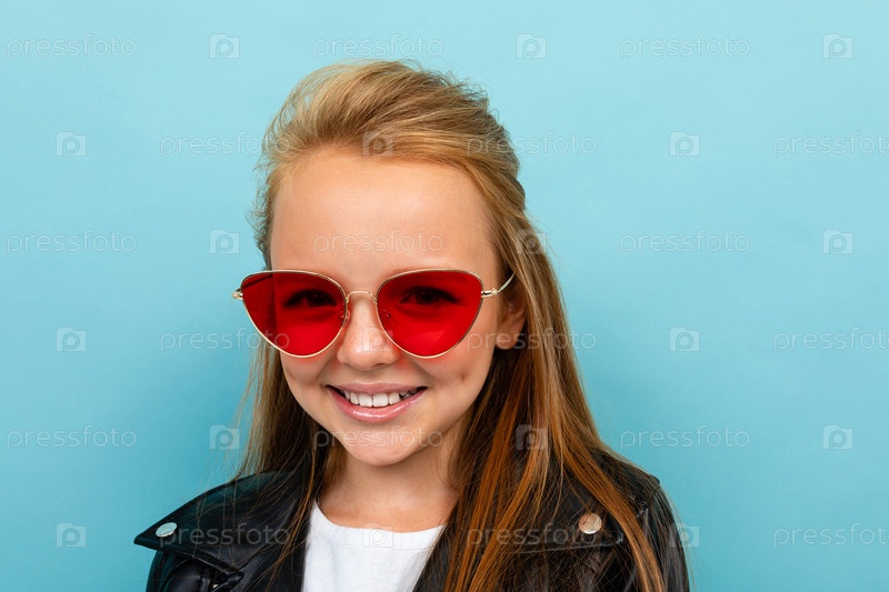 Кавказская девушка-подросток с каштановыми волосами в черной куртке держит красные солнцезащитные очки на синем фоне