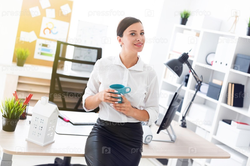 Молодая девушка стоит в офисе и держит чашку