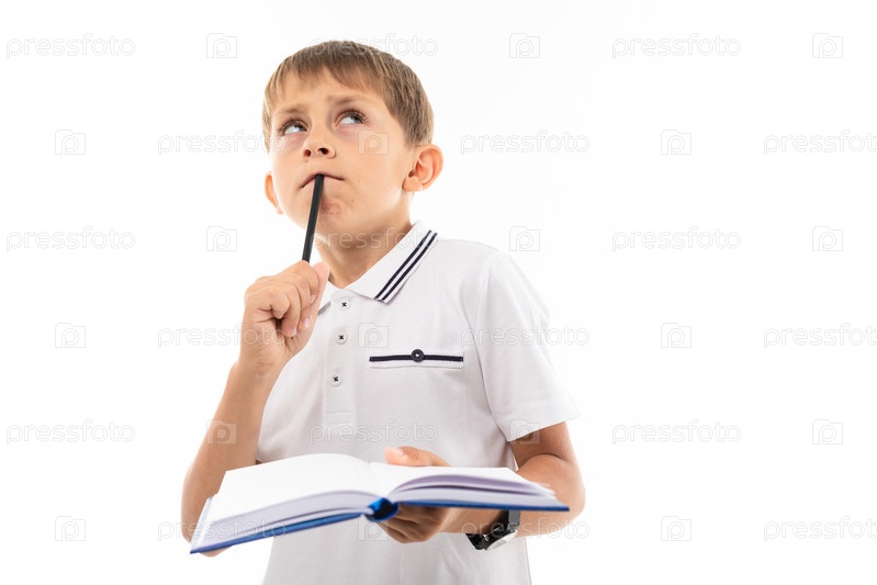 Молодой кавказский подросток делает домашнее задание и думает изолированно на белом фоне