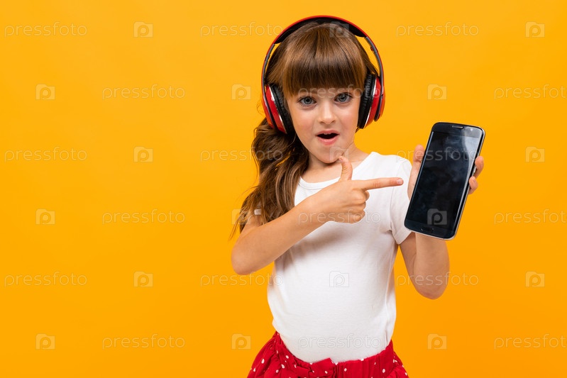 Красивая маленькая девочка в платье слушает музыку на желтом или оранжевом фоне