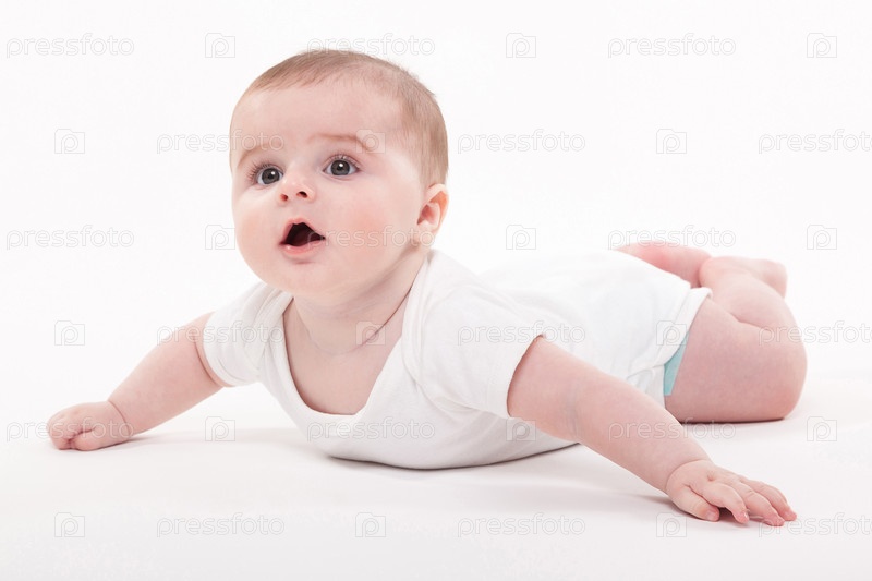 Ребенок в теле лежит на животе на белом фоне и смотрит в камеру, изображение с глубиной резкости
