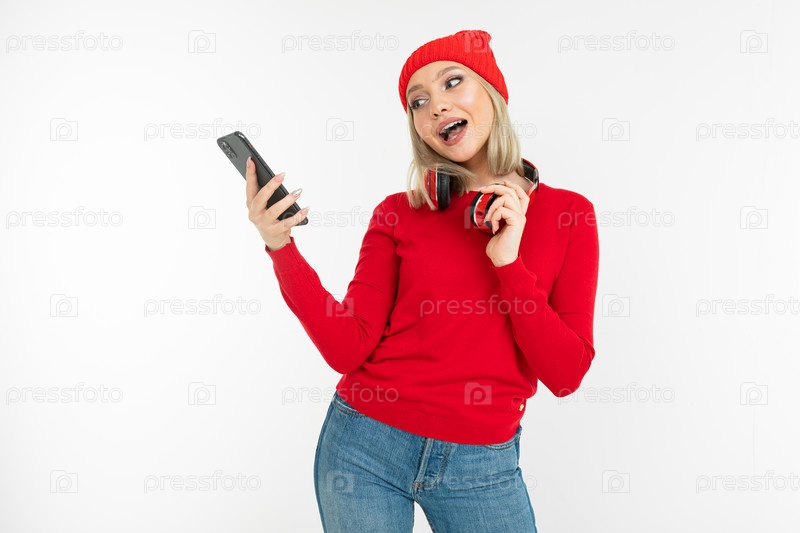 Стильная девушка со смартфоном в руках и наушниками на белом фоне