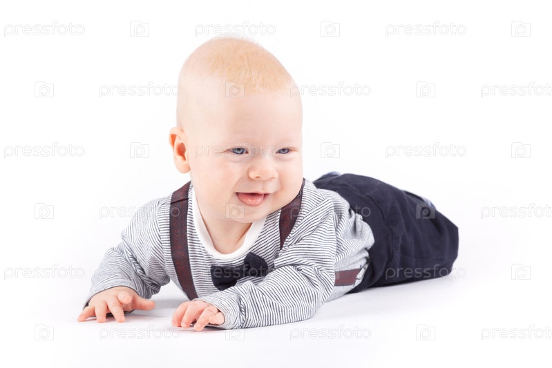 Изолированный на белом, веселый кавказский мальчик в костюме с подтяжками