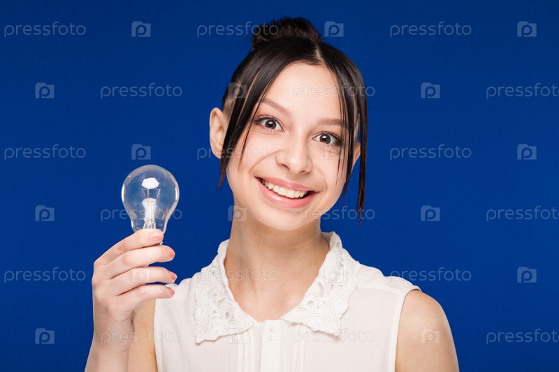 Брюнетка девушка с лампочкой на синем фоне
