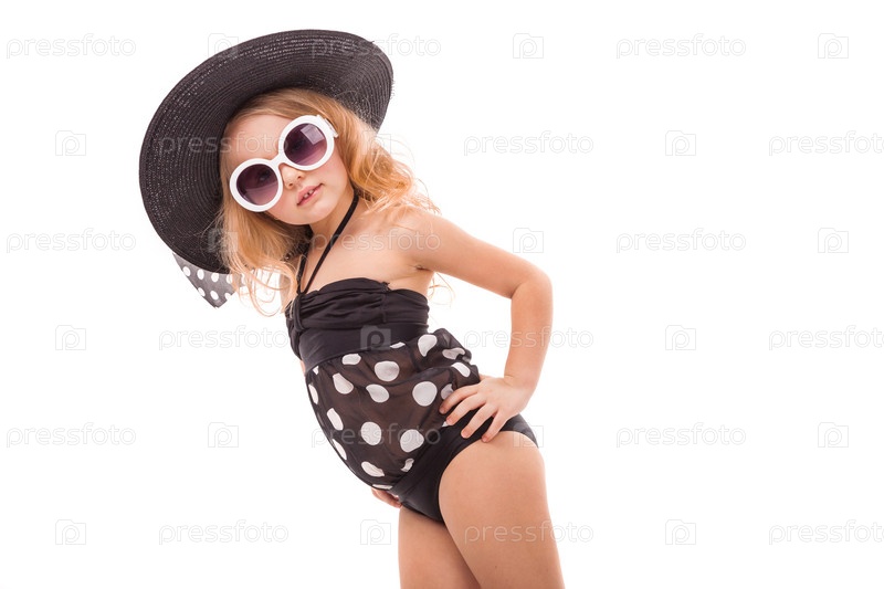 Изолированная на белом, маленькая симпатичная серьезная кавказская блондинка в черных купальниках, белых солнцезащитных очках и подставке с большой черной шляпой, застенчивая, руки на талии, перевернутая фотография, взгляд в камеру