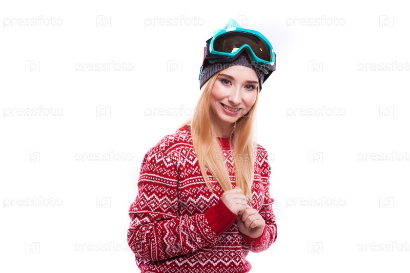 Привлекательная молодая женщина в красном свитере и синих лыжных очках