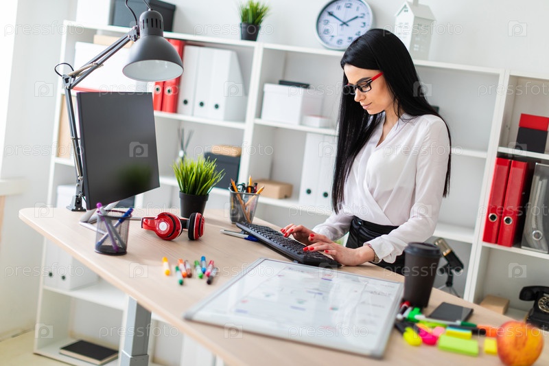В офисе работает молодая девушка в очках, в белой блузке и черных брюках. У девушки длинные прямые черные волосы. фото с глубиной резкости