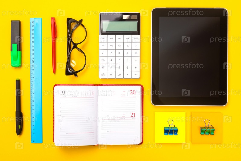 Плоская планировка офисного стола. Вид сверху рабочего стола с калькулятором, ноутбуком, планшетом и канцелярскими принадлежностями, канцелярскими принадлежностями на цветном желтом фоне. Вернуться к школьной концепции