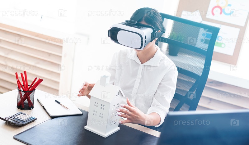 Молодая девушка сидит в очках виртуальной реальности. Перед ней на столе план дома