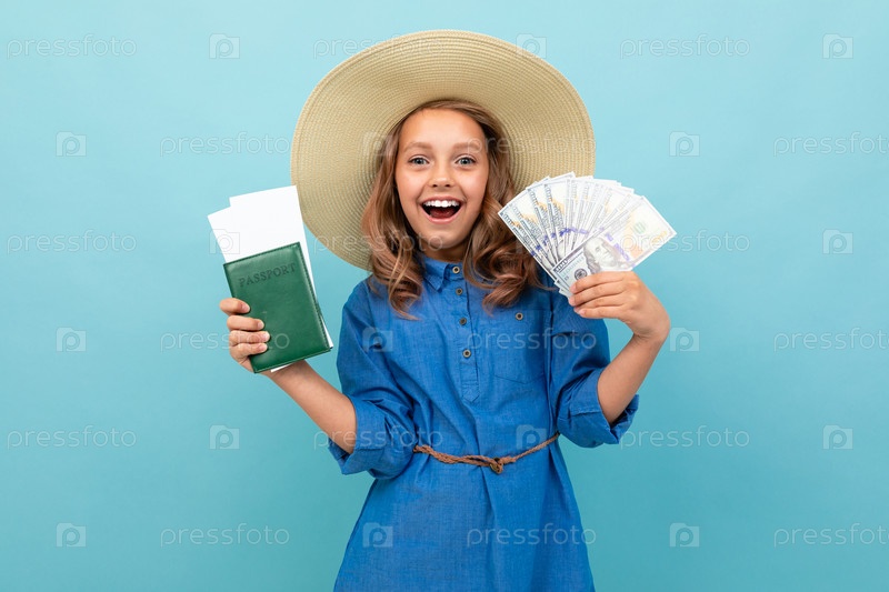 Кавказская девушка с волнистыми каштановыми волосами в голубом платье, в большой шляпе показывает паспорт с билетами, деньгами и радуется на синем фоне