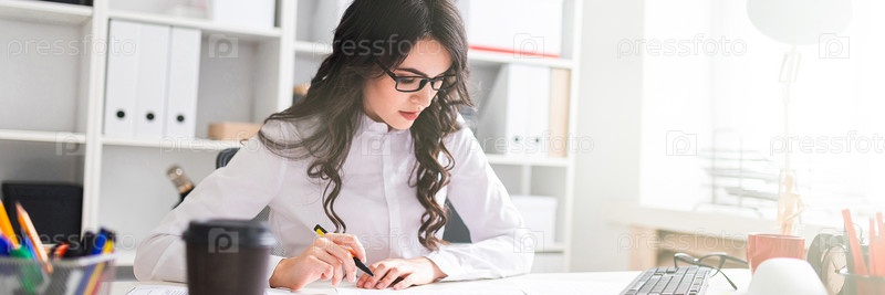 Очаровательная молодая девушка работает в светлом офисе. фото с глубиной резкости