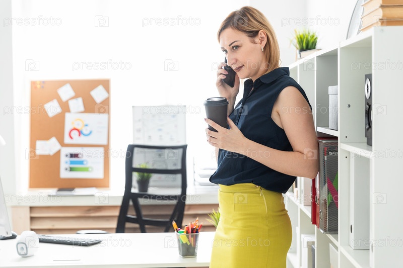 Очаровательная молодая девушка, работающая в ярком офисе. У девушки светлые волосы. На ней черная блузка и желтая юбка. фото с глубиной резкости