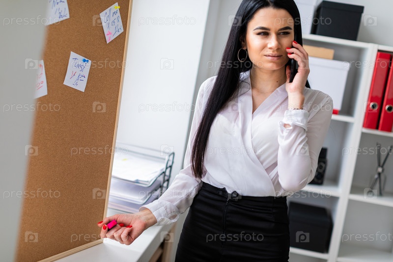В офисе работает молодая девушка в очках, в белой блузке и черных брюках. У девушки длинные прямые черные волосы. фото с глубиной резкости