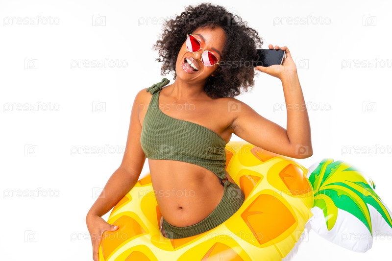 Красивая африканская женщина в купальнике стоит с большим красочным резиновым кольцом, танцует и улыбается на белом фоне